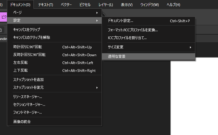 そんな時、ドキュメント→設定→透明な背景にチェックするだけで、背景が透明になります!